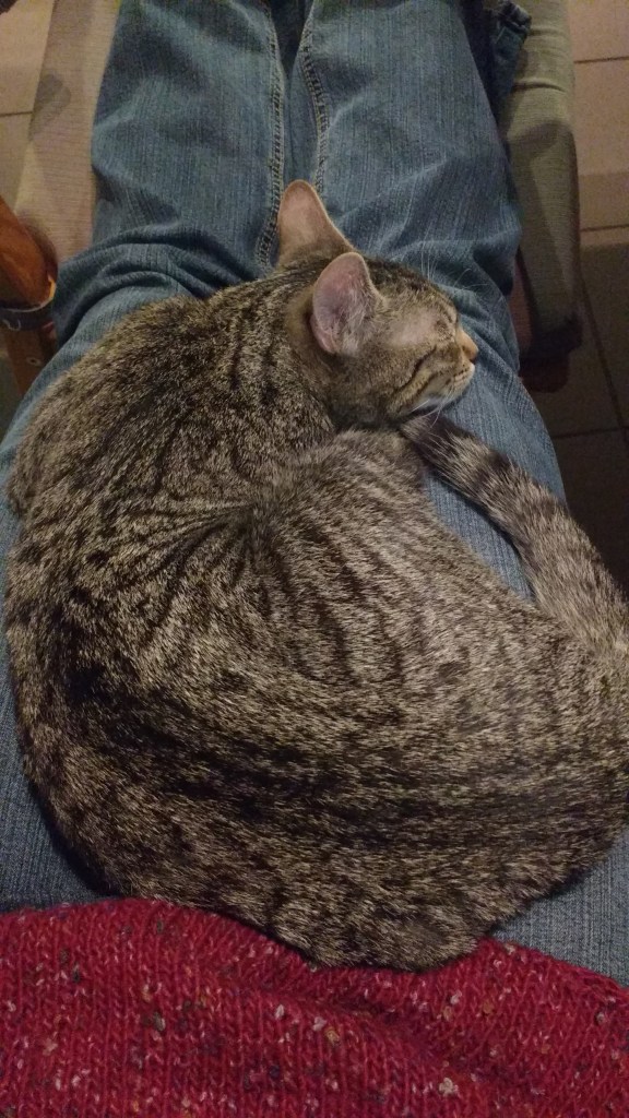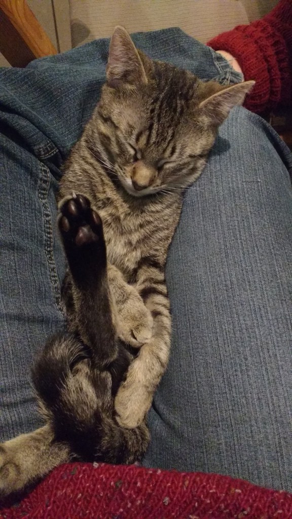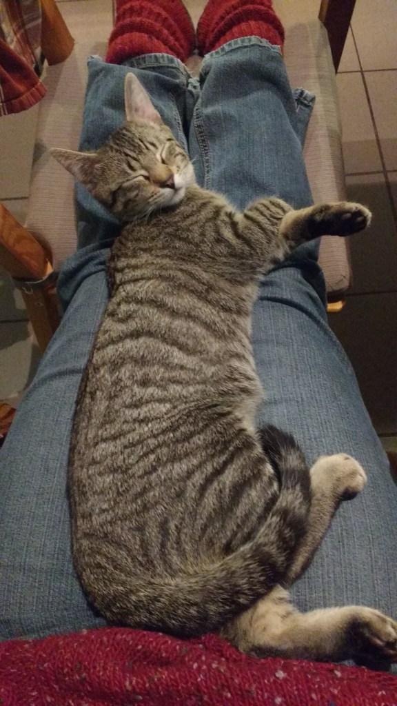 Meine Beine habe ich auf den Stuhl neben mir gelegt, den Rücken an die Wand gelehnt. Auf meinem Schoß schnurrt der kleine Kater, holt sich seine Streicheleinheiten ab und rollt sich wieder zu einer Kugel zusammen oder streckt sich auch schon einmal lang über meine Beine aus. Er ist der Grund warum ich noch nicht aufgestanden bin, um die Küche aufzuräumen. 😉