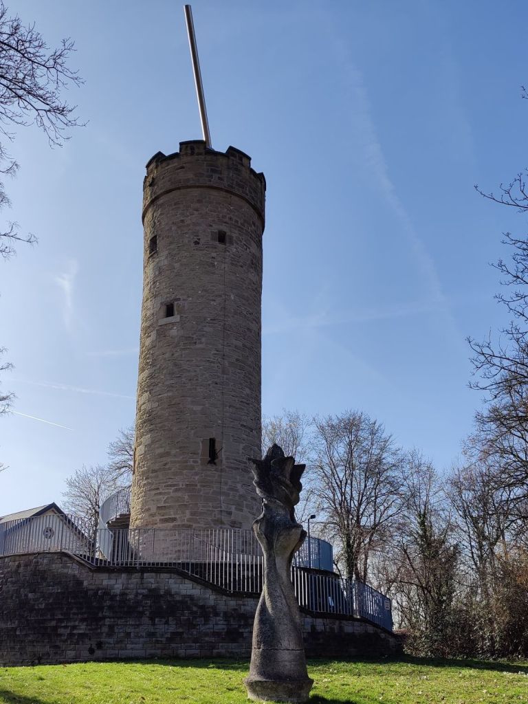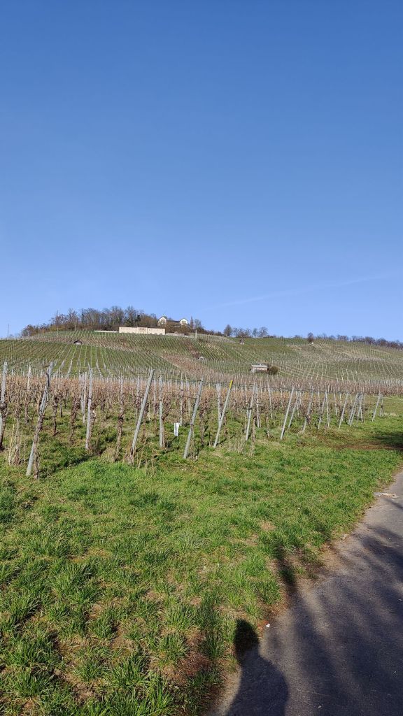 Und weil wir schon Mal unterwegs waren ging’s dann noch weiter rauf: Durch die Weinberge auf den „Hausberg“ was für mich als Flachländer:in immer etwas lustig klingt, so als wäre der Berg die Erweiterung des eigenen Gartens. Oben auf dem Wartberg jedenfalls gibt’s einen weiteren Turm zu besteigen oder von unten die Lichtkunst „Sonnenstrahl für Heilbronn“ von Jan Van Munster zu bewundern. Statt hoch kann man auch runter ins Tal auf die Stadt gucken oder die Salamander beobachten die in großer Anzahl über die warmen Steine huschen. Von dort startet auch der Weinwanderweg, den wir uns ebenfalls für’s nächste Mal aufgehoben haben.