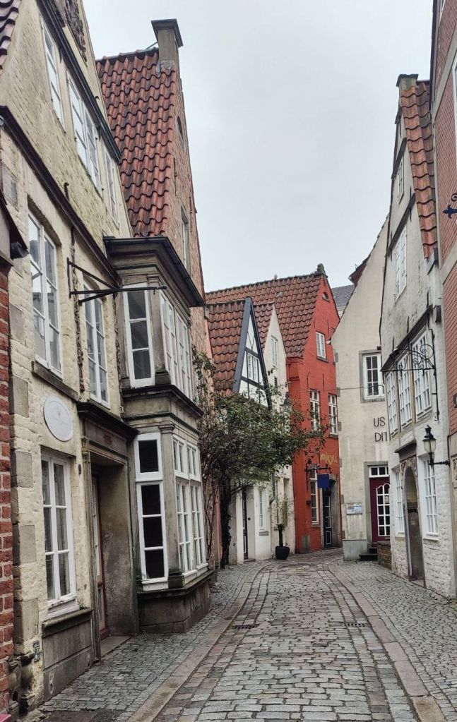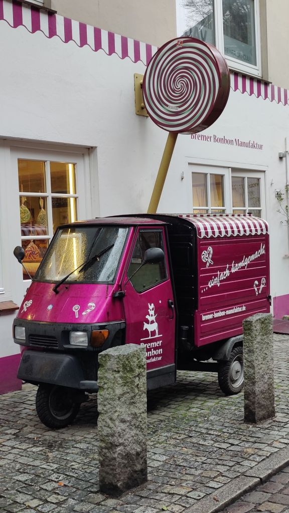Nach dem Frühstück bummel ich im Nieselregen noch ein bisschen durch das malerische Schnorr-Viertel. Besonders fällt mir ein Regenschirm-Fachgeschäft und der Plattenladen „Schnoor-Records“. Beide kommen aber auf die Bucked-List, denn ich will noch einen Abstecher in die Bremer Bonbon Manufaktur machen, die F. mir empfohlen hatte. Auch hier werde ich nicht enttäuscht, fühle mich kurz wie in Bullerbü und verlasse den Laden mit einem Glas Lakritzbonbons.
