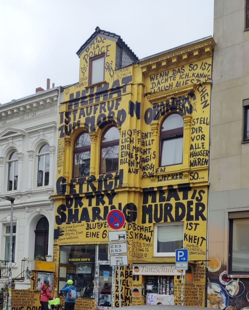 Der nächste Stopp führt mich ins Viertel „Viertel“, das ein bisschen nach der hippen Seite von Berlin aussieht: Viel Street-Art, Cafés, Restaurants und mitten drin der linke Buchladen Golden Shop. Hinter der goldenen, viel zitierten Fassade stapeln sich Bücher und Menschen. In der letzten Woche ist der Buchladen von der Nominiertenliste des für den Preis des deutschen Buchhandels gestrichen worden. Weil er angeblich dem linksextremen Spektrum zuzuordnen sei. Seit dem reist der Strom der solidarische Besuchenden nicht ab. Viele fragen nach Möglichkeiten zu unterstützen, kaufen Gutscheine, spenden für den anstehenden Prozess. Es ist wuselig und ein bisschen kämpferisch. Es werden Witze gerissen aber auch Anspannung und Überraschung sind zwischen den Zeilen der Gespräche spürbar. Hat wirklich der Verfassungsschutz den Laden beobachtet? Wie intensiv und wen genau? Ich nehme mir viel Zeit, schlenderte alle Regale ab und genieße es sehr Mal wieder so richtig in einen Buchladen einzutauchen. Natürlich nehme ich auch zwei Bücher mit.