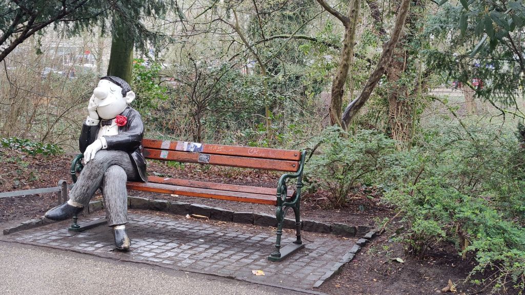 Nach einem Mittagessen im nur wenige Meter entfernten Café Piano entschließe ich mich zu einem kleinen Umweg. Dachte ich zumindest. Denn ich verfahre mich im Nieselregen nur um ein Foto von einer Bank zu machen. Aber es hat sich gelohnt. Ich meine: so gelassen lächelnd im Regen zu sitzen ist schon auch eine Kunst und lässt mich mit einem Lächeln weiter fahren zur Kunsthalle.